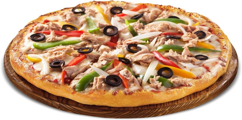 tomatensaus, kaas, paprika, ui, champignons, olijven en tonijn