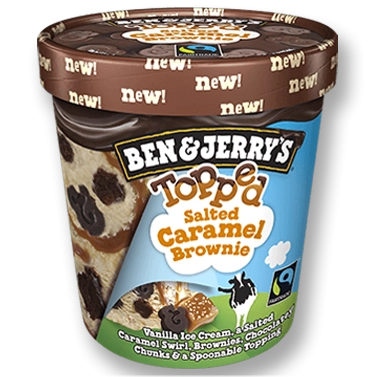 Vanilleroomijs met een gezouten karamel swirl, brownies choco chunks en een zachte choco topping.