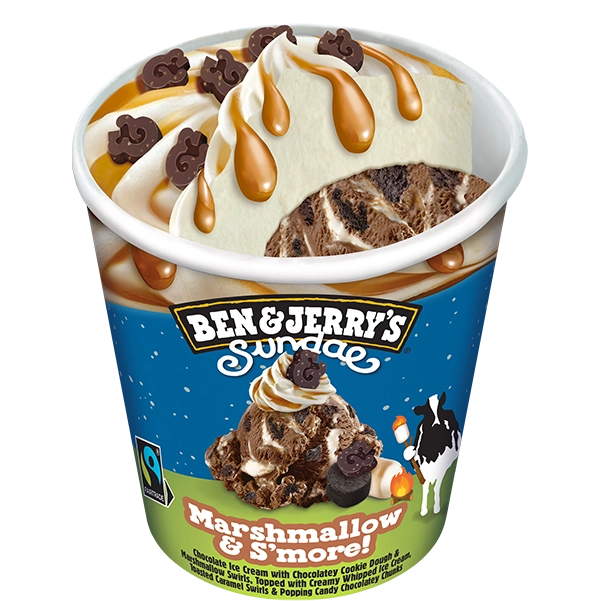 Roomijs met chocoladesmaak, stukken koekdeeg van cacao en marshmallowsaus, een slagroomijstopping, karamelsaus met een geroosterde marshmallowsmaak en stukken magere cacao met knettersuiker.