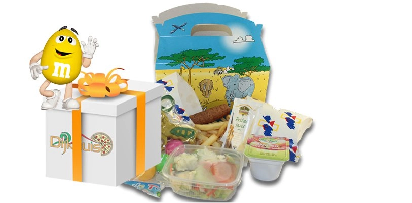 met salade, appelmoes, mayonaise, patat en een verrassing.