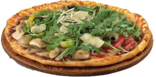 tomatensaus, kaas, paprika, ui, champignons, pesto, olijven,, parmezaanse kaas, rucola en pijnboompitten
